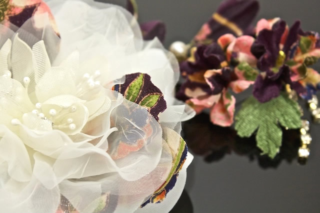 オーガンジーの花びらと和柄の花びらを幾重にも重ね合わせたお花飾り。