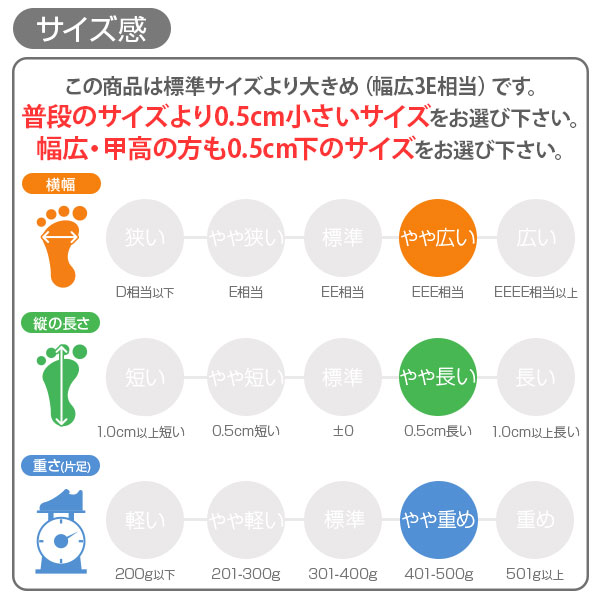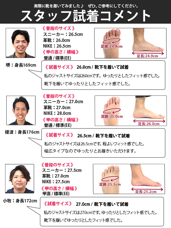 | こちらの商品は【標準サイズより大きめ(幅広3E相当)】です。 普段お履きのサイズより0.5cm小さいサイズをお選び下さい。 幅広設計なので、甲高・幅広の方も0.5cm小さいサイズをお選び下さい。 【男性スタッフ小牧(172cm) 普段のサイズは、革靴27.0cm/日本製スニーカー27.5cmです】 私のジャストサイズは27.0cmでした。靴下を履いて、ゆったりとしたフィット感のあるサイズです。 |