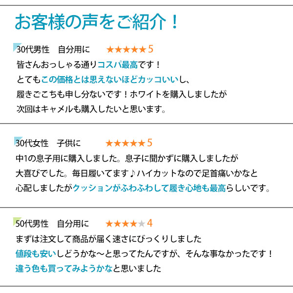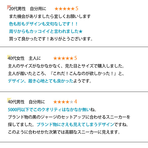 - コスパ最高です 履き心地もよく、歩いても疲れない 一廻り大きなサイズを購入しました 今回2度目の同じスニーカー また買いました めっちゃカッコいいです めっちゃお洒落です また買いたいです