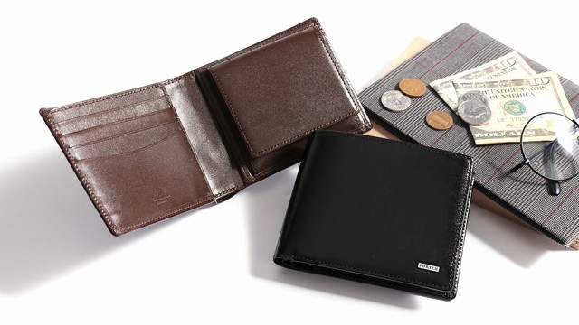 艶やかなレザーが魅力の小物シリーズ『SHEEN/シーン』の二つ折り財布。表面にあしらったブランドロゴプレートがデザインのアクセントになっています。使いやすさ抜群の収納設計とシンプルかつ上品なルックスで、年齢問わず合わせやすくギフトとしてもオススメです。