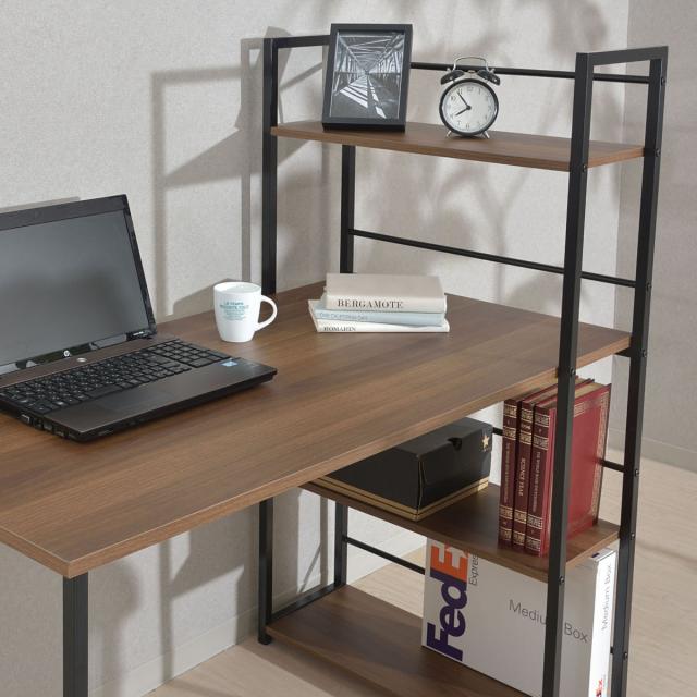 デスク 幅120cm ラック付き 木目調 ( パソコンデスク 机 PCデスク シンプルデスク オフィスデスク 本棚付き SOHOデスク 在宅ワーク 収納 棚付き スチール脚 木目調天板 大人 勉強机 ブラウン ナチュラル )