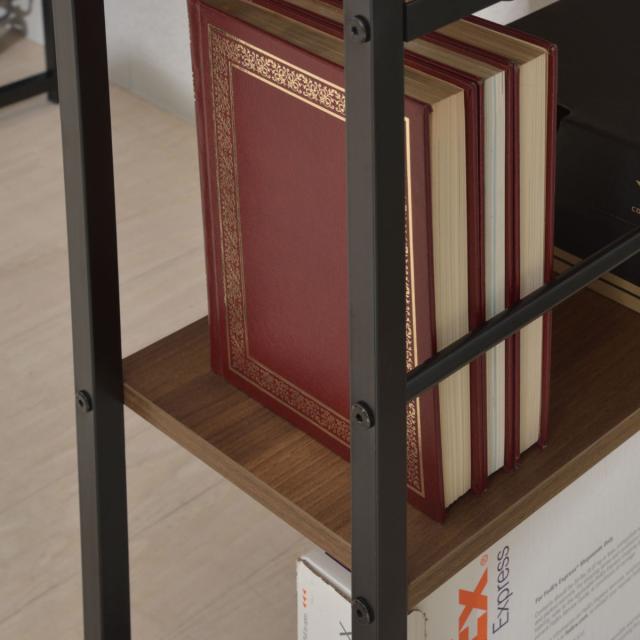 オープンラックには背板が付いていませんが、本などが落ちないように止めが付いていますので、壁際だけでなくお好きな場所にレイアウトしていただけます。