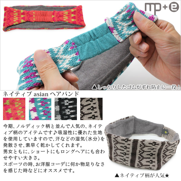 今期、ノルディック柄と並んで人気の、ネイティブ柄のアイテムです♪オールシーズンOKのこちらのヘアバンドは、吸湿性に優れた生地を使用していますので、汗などの湿気(水分)を発散させ、素早く乾かしてくれる利点が備わっています。厚みや太さもちょうどいいサイズになっていますので、男女ともに、ショートにもロングヘアにも合わせやすい大きさ。スポーツの時、お洋服コーデに何か物足りなさを感じた時などにオススメです。