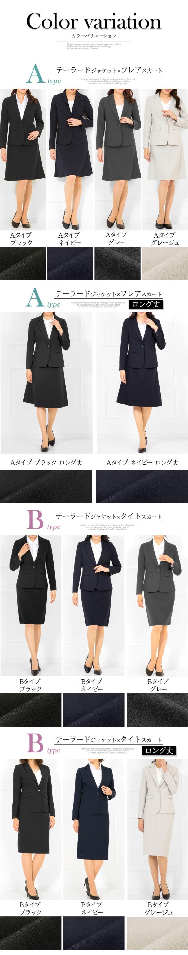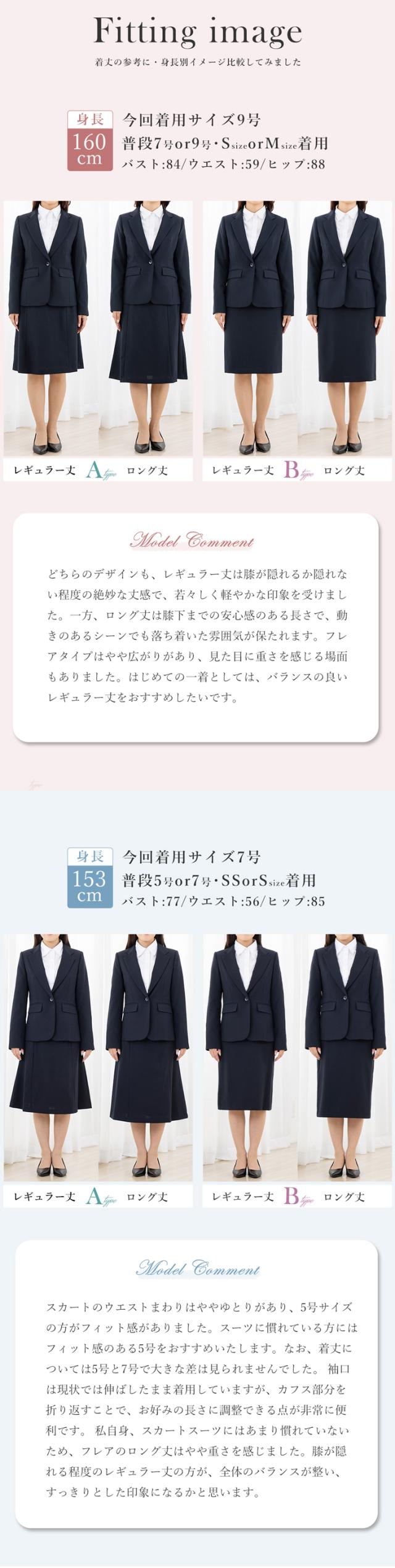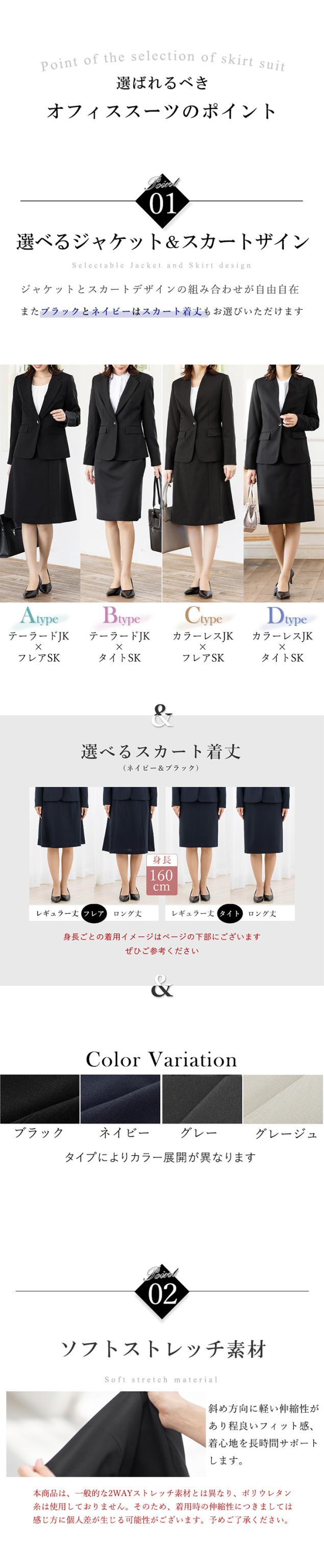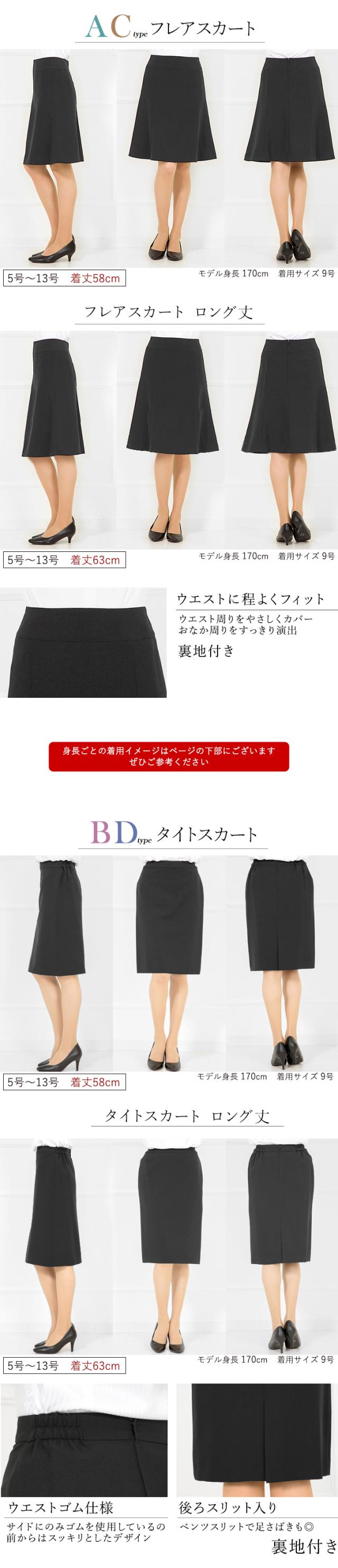 スカートは体型カバー力のあるゆったりとしたエレガントなフレアスカートと、スリムなシルエットですっきりと大人かっこよく着用でき、就活などリクルートにも使えるタイトスカートからお選びいただけます。