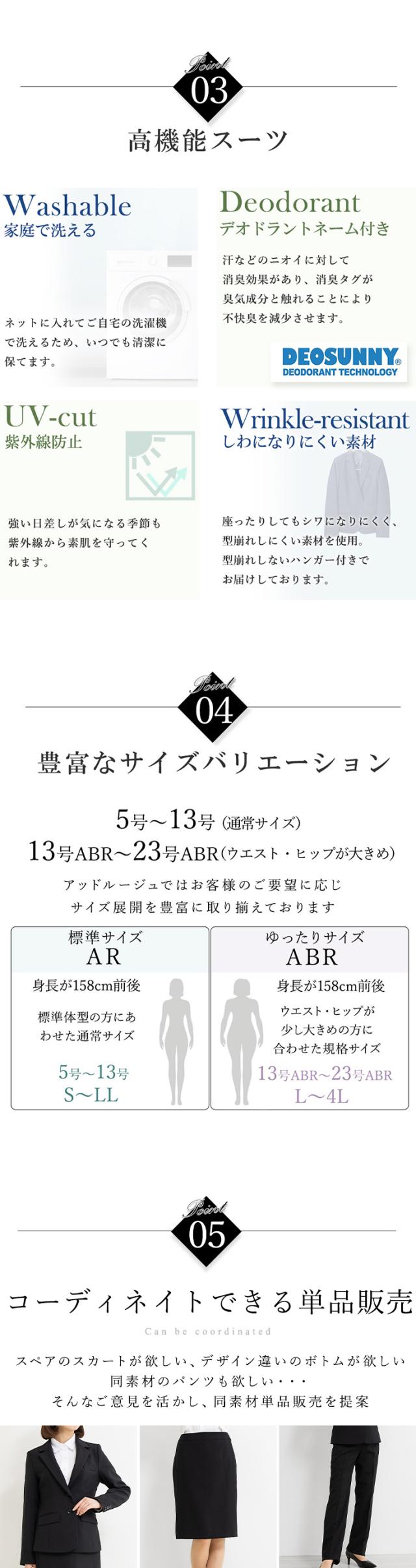 ビジネススーツの定番として、リクルートスーツとして、女性の様々なスーツシーンに対応します。
