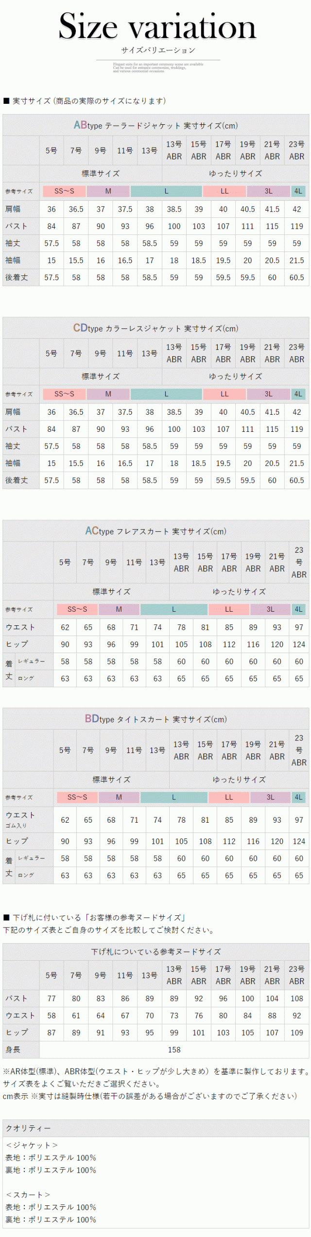 5号・7号・9号・11号・13号・15号・17号・19号・21号・23号 小さいサイズ〜大きいサイズ(ラージサイズ)。ゆったりとしたABR体あり |