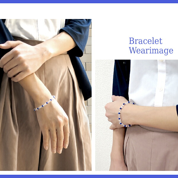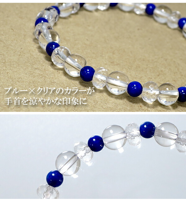 美しい青色の際立つ綺麗なラピスラズリとクリアのカラーが手首を涼やかに彩ります。