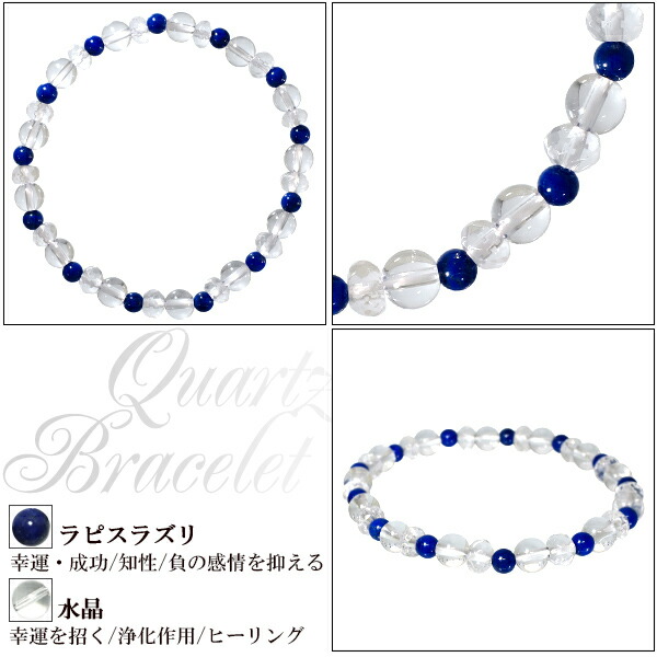 水晶の合間にきらめく、深い青色のラピスラズリが印象的なブレスレット。