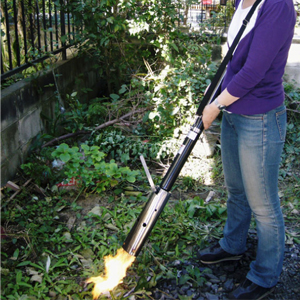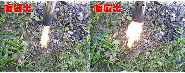 灯油ガス化方式の高火力草焼きバーナー。経済的な灯油を燃料とした、草焼きバーナーが大人気。灯油をガス化することで約15,000kcal/hの高火力が得られ、雑草も害虫も一気に焼却できます。最高温度約1,000度の高温だから、ダイオキシンも発生しにくい高性能。1.5Lのタンクいっぱいに給油すると、約50分連続使用でき、安定した強力な火力を持続します。筒先が楕円形なので、炎の幅も自在に調節可能。全長123cmだから、使用中でも炎が足元に近づきにくい安全設計。