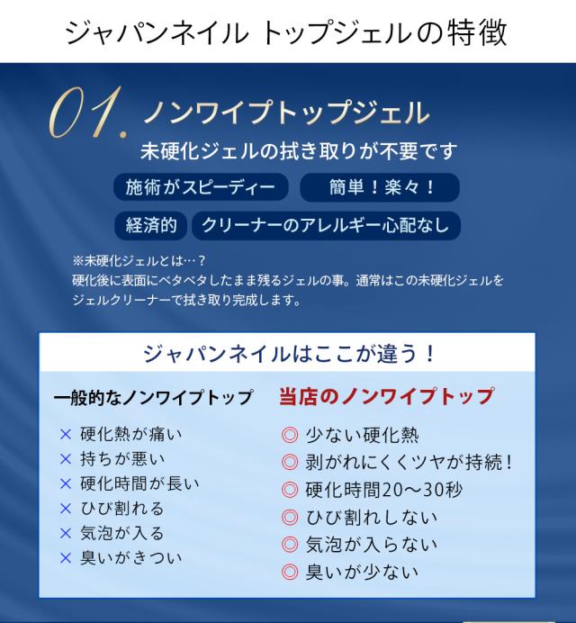 ジャパンネイルのトップジェルは、すべて未硬化ジェルの拭き取りが不要なノンワイプタイプのトップジェル。施術がスピーディーに行え、簡単で経済的。