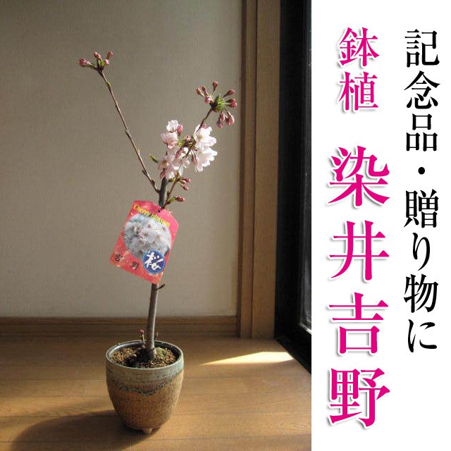 染井吉野染井吉野は江戸の染井村の植木屋が「吉野桜」として売り出した桜といわれ。生長が早いこと、葉より先に花が咲くこと、花つきがよいことなどから、全国に広まり、現在の桜開花情報の対象となるほどのとても 一般に知られている人気のある桜です。ソメイヨシノ(染井吉野)は、4月頃、葉が出る前に薄桃色の五弁花を4〜5個固まって散房花序に咲く落葉高木です。秋の紅葉もとても綺麗で 見事です。 記念日 お祝い事や 贈り物に 桜はなかなか いいですよ 信楽鉢入り高さは 約 50センチ
