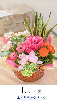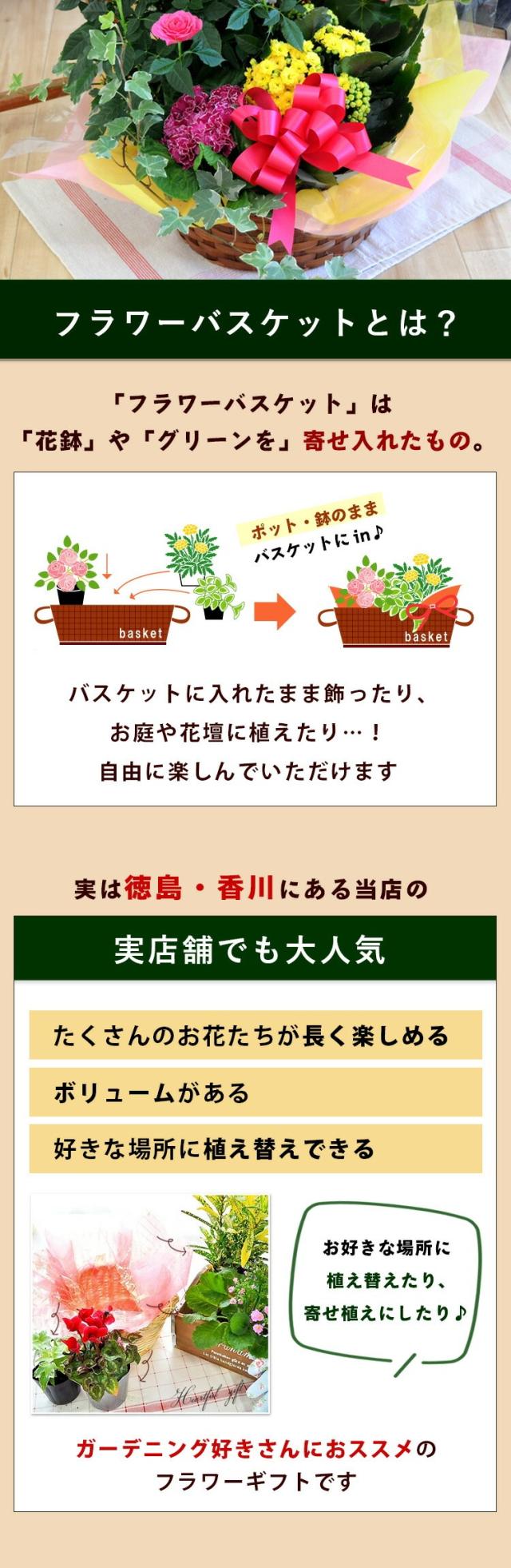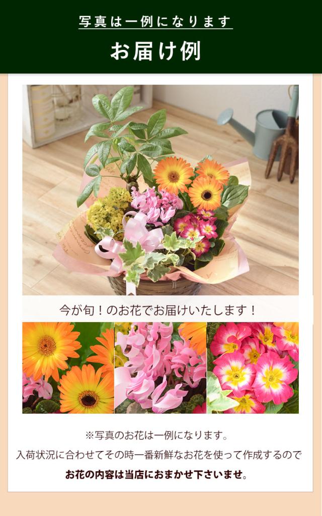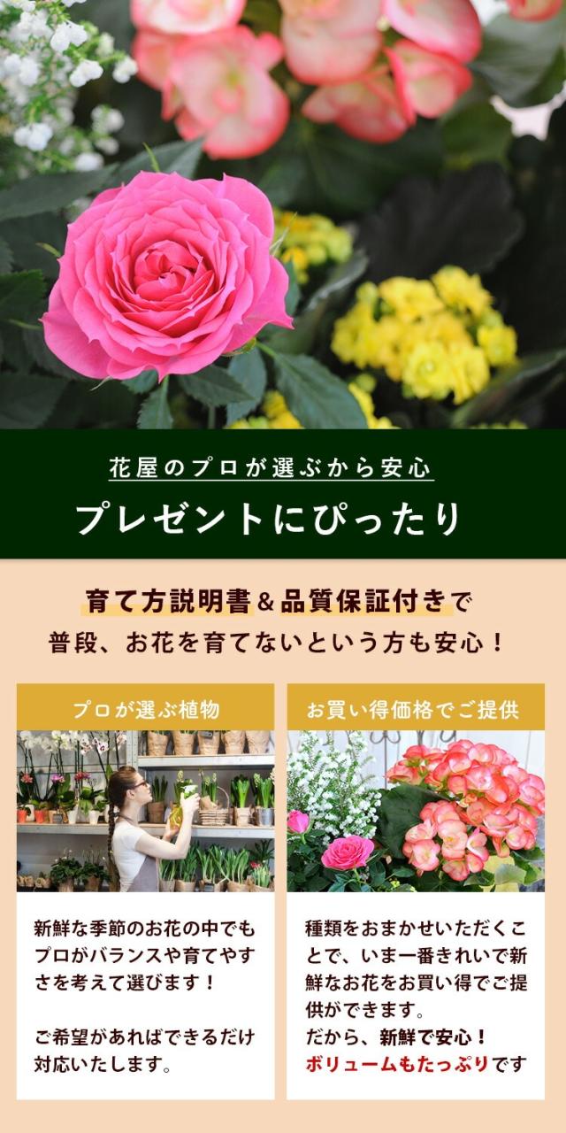 | 内容 | 季節の花、観葉植物/バスケット(デザインおまかせ)/ラッピング/リボン/ 育て方説明書/ 品質保証付きショップカード ご希望の方にメッセージカード *入荷状況により、資材の種類が異なる場合がございます。 |