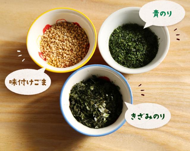 ごま[中南米(パラグアイ、グアテマラ)]、ぶどう糖、食塩、醤油(大豆、小麦)、乾のり(国産)、青のり(国産)、調味料(アミノ酸等)、甘味料(ステビア)、卵殻カルシウム