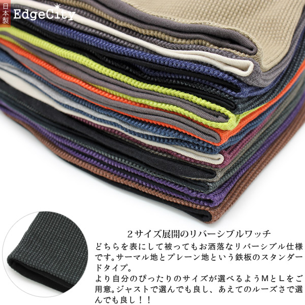 デザイン違いの両面被れるリバーシブルニット帽です。お洋服でも人気のサーマルと、シンプルなプレーンの組み合わせ。どちらを選んでも間違いない、お洒落な鉄板ワッチだと思います。サイズも4サイズから選べますので、ジャストサイズでお選びいただく方にも、わざとゆったり大きめで被りたい方にもオススメです。『日本人の日本人による日本人のためのワッチ』というコンセプトにも納得の被り心地です。