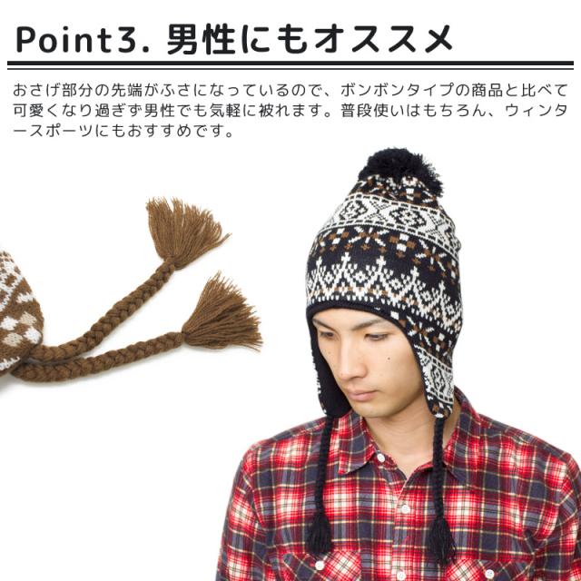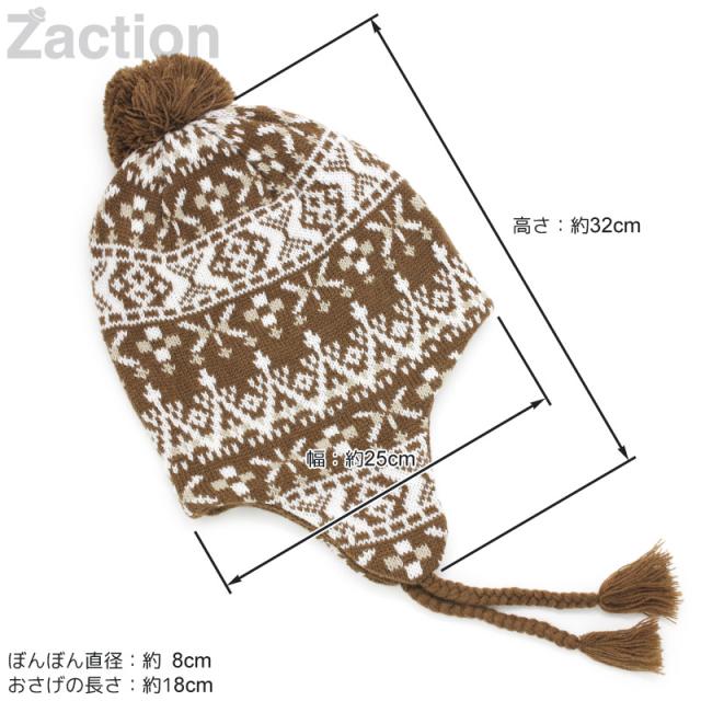 細やかなパウダースノーが広がったような雪柄模様の耳あて付きニット帽がZactionオリジナルで完成しました。北欧の伝統的なノルディック柄が、どこか懐かしい温もりを感じさせシンプルなコーディネートのアクセントにぴったりです。ふっくら柔らかなアクリル素材は、チクチク感が少なくウールのようなあたたかさを持ちながら軽くてお手入れも簡単、長時間かぶっていても疲れにくく冬場の防寒に最適です。おさげ部分の先端がふさになっているので可愛くなりすぎず、男性にも気軽に被っていただけます。耳まで覆われるニット帽なので、耳はもちろん頭全体をしっかり温かく包み込んでくれるため、普段使いはもちろん、ウィンタースポーツにもおすすめです。※TOPのボンボンは、取外しが出来ません。
