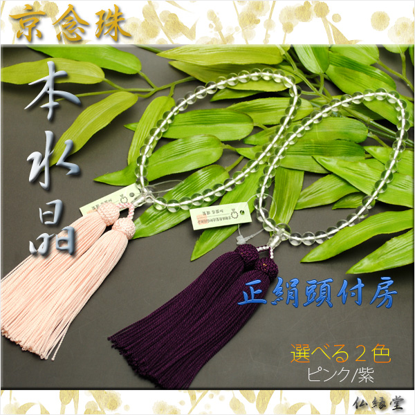 【京念珠 本水晶共仕立】女性用:正絹頭付房(紫)化粧箱付きでネコポス送料無料