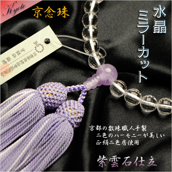 京念珠【ミラーカット:水晶紫雲石仕立】女性用数珠・正絹頭付房 ネコポス無料