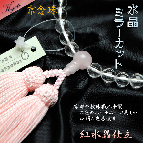 京念珠【ミラーカット:水晶紅水晶仕立】女性用数珠・正絹頭付房 ネコポス無料