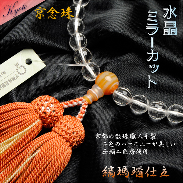 京念珠【ミラーカット:水晶縞瑪瑙仕立】女性用数珠・正絹頭付房 ネコポス無料