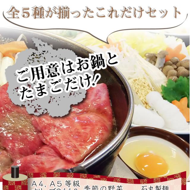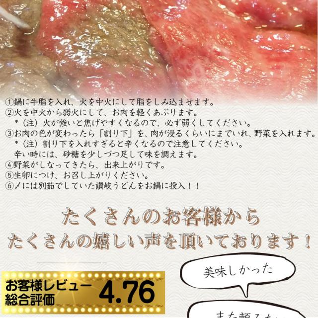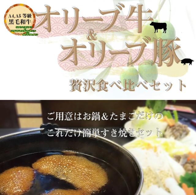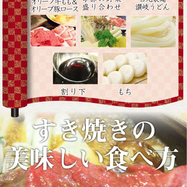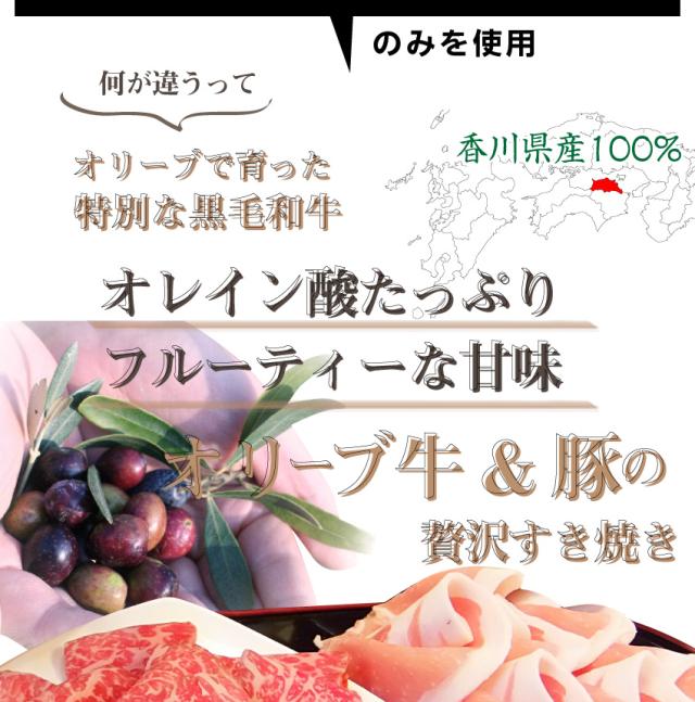 | 内容量 | オリーブ牛500g、オリーブ豚500g、野菜盛り合わせ、割り下、丸もち、ケンネアブラ、石丸製麺讃岐うどん660g |