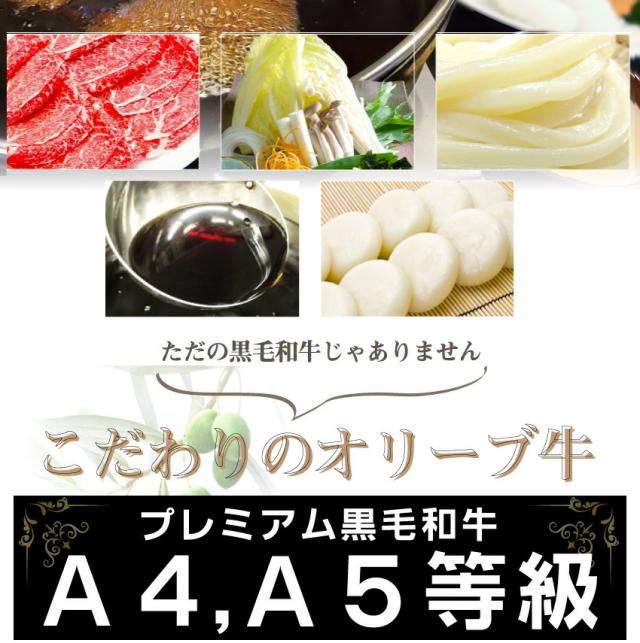 | 原材料 | オリーブ牛もも オリーブ豚ロース [野菜盛り合わせ]大根・白菜・玉ねぎ・水菜・えのき・しめじ・マロニー・長ネギ・ニンジン等 [半生うどん]:小麦粉(国内製造)、食塩/加工でん粉、ph調整剤 [うどんつゆ]:しょうゆ(大豆・小麦を含む)、加糖ぶどう糖液糖、食塩、砂糖、かつおぶし、いわしにぼし、米発酵調味料、こんぶエキス(さばを含む)/調味料(アミノ酸等) [割り下]:しょうゆ(小麦・大豆を含む)(国内製造)、砂糖、米発酵調味料、昆布エキス/アルコール、調味料(アミノ酸等) |