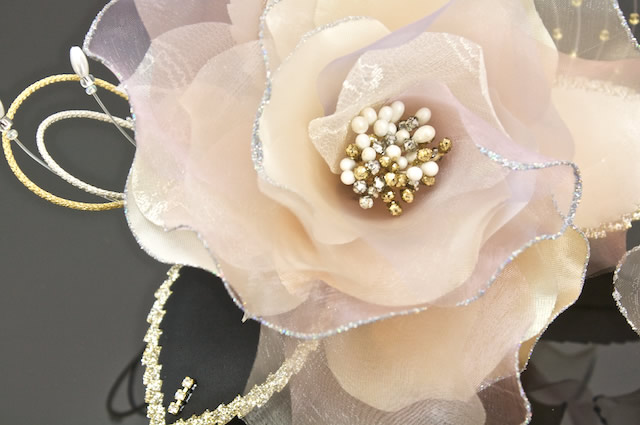 オーガンジーの花びらとレースの花びらを幾重にも重ね合わせたお花飾り。