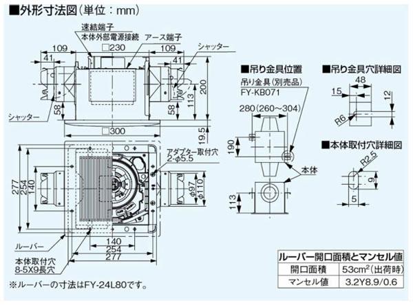 ■主な仕様■ 用途:トイレ、洗面所 埋込寸法:240mm角 適用パイプ径:φ100mm ルーバーおよび子機(吸込みグリル)は別売です 大風量形 低消費電力/低騒音設計 風圧式高気密シャッター付 電源接続部:本体外部速結端子 本体:鋼板製、羽根:樹脂製 別売スイッチ:FY-SV06W ※浴室など湿気の多い所には取付けないでください。故障の原因になります。