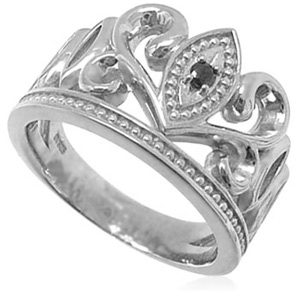 クラウンモチーフにブラックジルコニアを添えてシルバーリングにした、個性派カジュアルアイテム。変色防止のロジウムでコーティングされています。