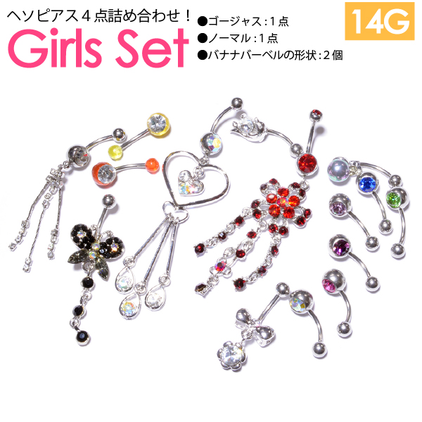 【メール便対応】福袋 Girls set 1 サイズ 14G(1.6mm) ヘソピアス4点 詰め合わせ!ボディピアス へそぴ バナナバーベル レディス ガールズセット ゴヤ—ジャス シンプル 14ゲージ ピアス┃