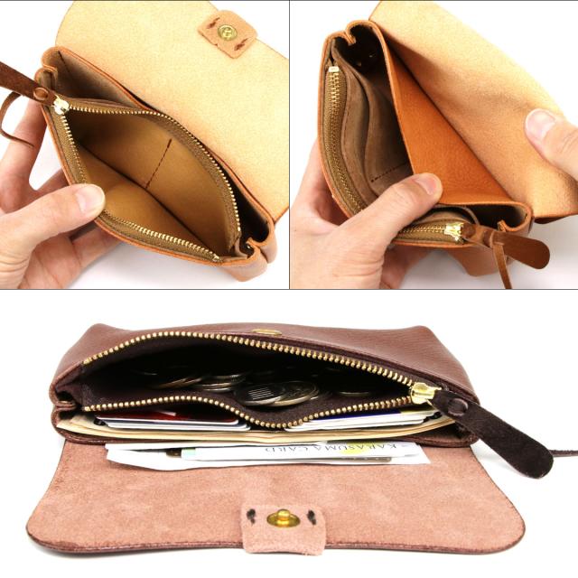 小銭入れは、しっかりと深さのある標準的なサイズ。コインがたっぷり入る上、ポケットに深さがあるため、カードを収納することもできます。たくさんのカードを持ち歩きたい方、コインケース別持ち派の方にオススメの使い方です。また、この部分には柔らかくて伸縮性のあるピッグスエード(豚革)を使用しています。