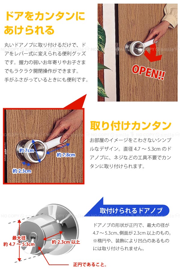 丸いドアノブに取り付けるだけで、ドアをレバー式に変えられる便利グッズです。握力の弱いお年寄りやお子さまでもラクラク開閉操作ができます。 手がふさがっているときにも便利です。 お部屋のイメージをこわさないシンプルなデザイン。直径4.7〜5.3cmのドアノブに、ネジなどの工具不要でカンタンに取り付けられます。 ※ドアノブの形状が楕円や、装飾により凹凸のあるもの、正面からみて正円でないもの、側面が2.3cm以上ないものには取り付けられません。 ※本商品は日本製です。