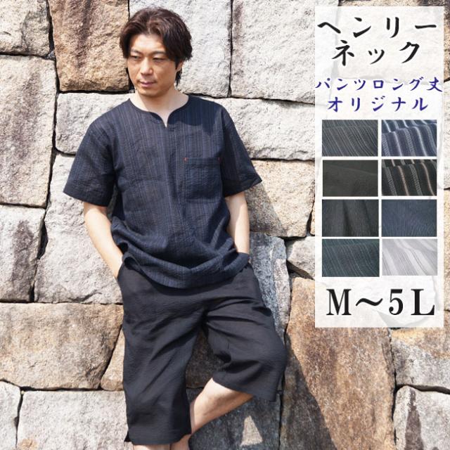 ヘンリーネック シャツ メンズ 上下セット しじら織り 綿80%麻20% 膝下ロングパンツ M/L/LL/3L/4L/5L