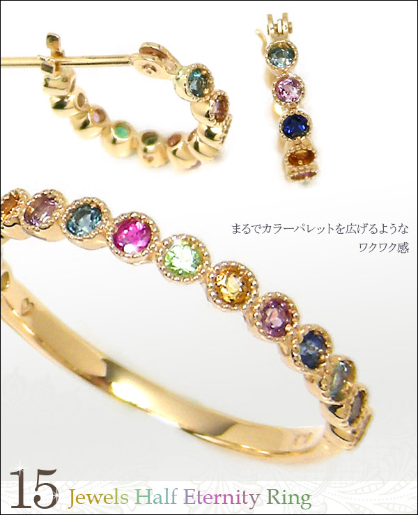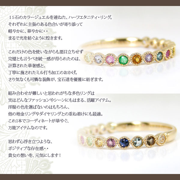 アミュレット リング ハーフ エタニティ K10/K18YG マルチストーン カラーストーン レインボー ミル打ち