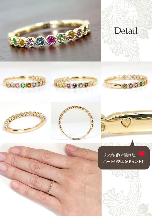 [材質]K10iorK18イエローゴールド[石](全て天然石)ペリドット,アイオライト,ピンクトルマリン,エメラルド,シトリン(濃),アメジスト,ブルートパーズ(濃),ルビー,グリーンガーネット,シトリン(淡),ロードライトガーネット,サファイア,アクアマリン,スモーキークォーツ,ブルームーンストーン(ラブラドライト)全て1.5mm[リング幅]2.2-1.9mm(11号)