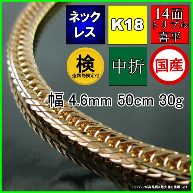 K18金 18k14面トリプル喜平ネックレス幅4.6mm50cm30g中折検定付F 送料無料 品質保証 敬老の日