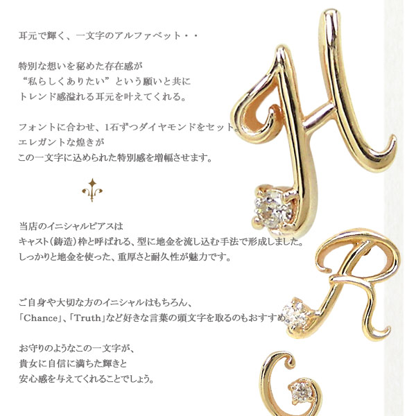 耳元で輝く,一文字のアルファベット。程よい愛らしさが漂うフォントも魅力。ダイヤを留めて、大きすぎず小さすぎずのベストバランスが上品な存在感と煌きを引き立てます。重厚な鋳造枠なので、末永くご愛用頂けますよ。