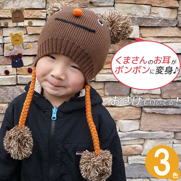 ニット帽 子供用 [メール便可] 帽子 キッズ ボンボン 秋冬 アニマル クマ / キッズ KUMAボンボン付きニット帽