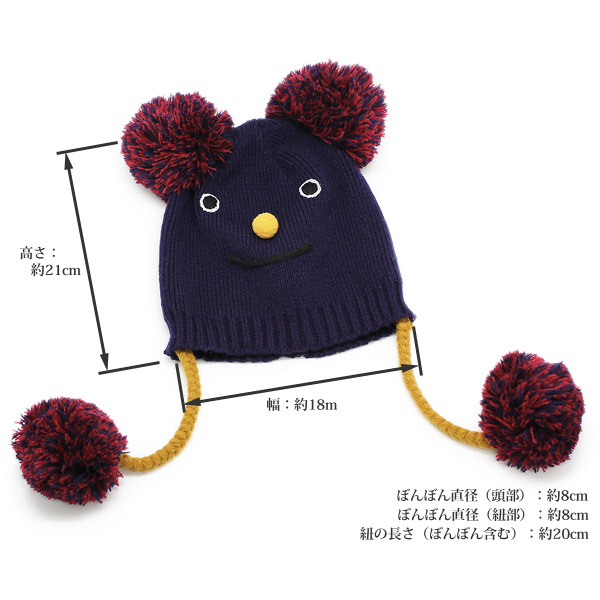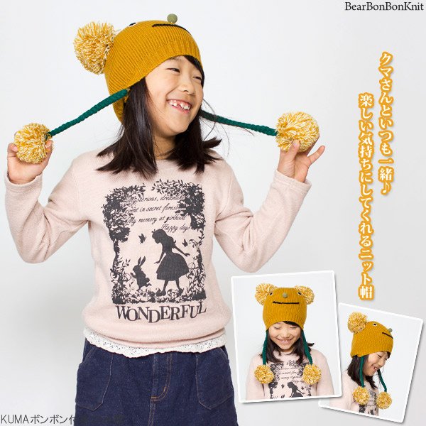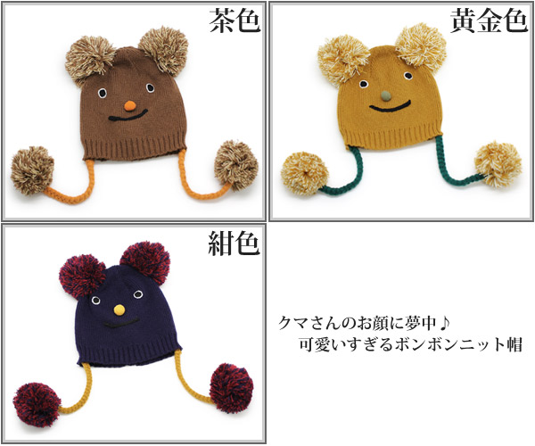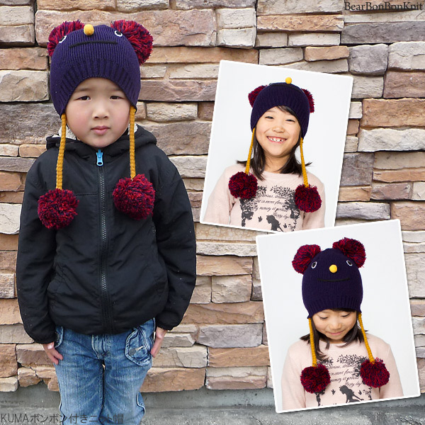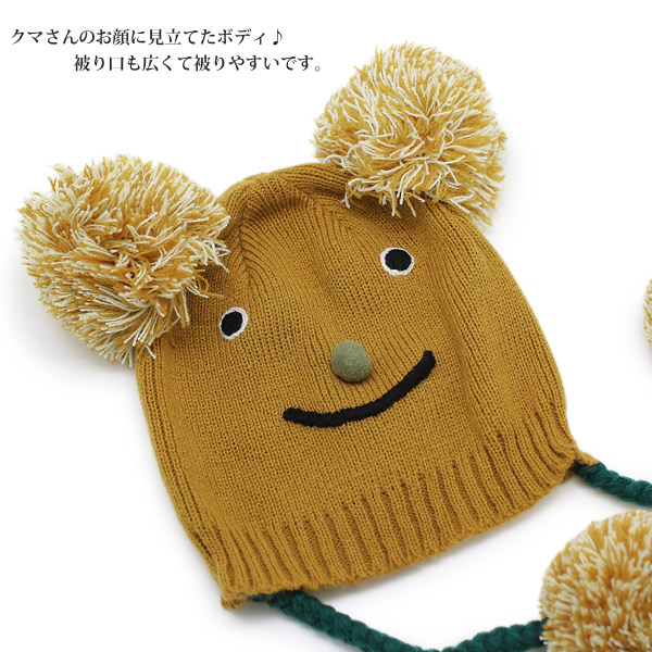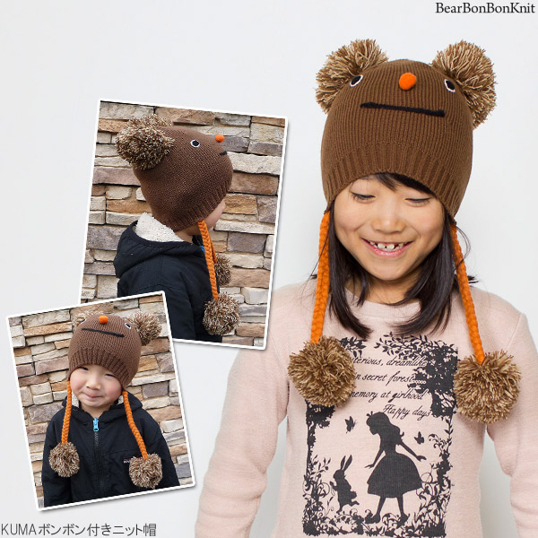 おでこからクマさんのお顔がこんにちは♪その愛くるしい表情がキッズにぴったりの可愛いデザインです。 通常TOP中央に1つ付くボンボンですが、クマさんのお耳にみたててお耳の位置に2個ついていてとってもCUTE☆☆☆おまけにおさげまでプレゼント♪被り口の締め付けもなく安心ですよ。