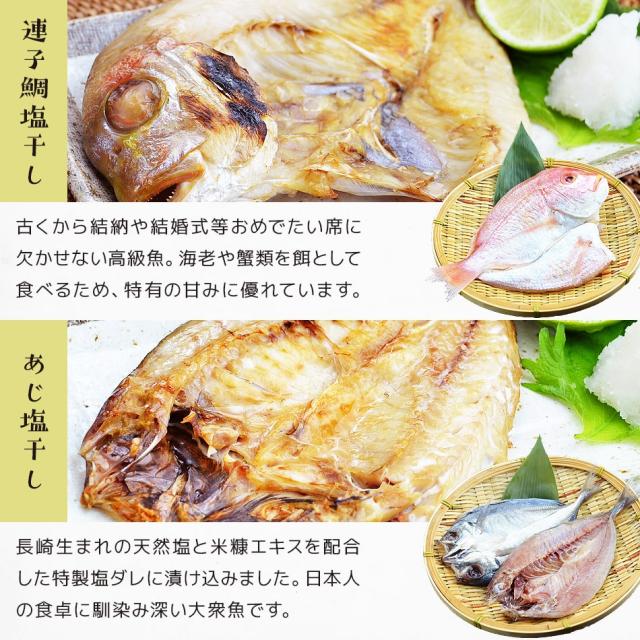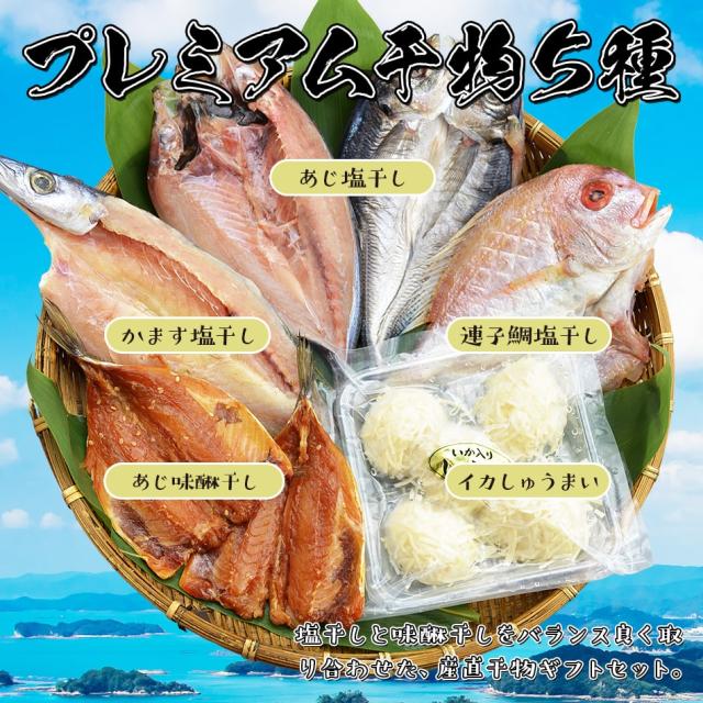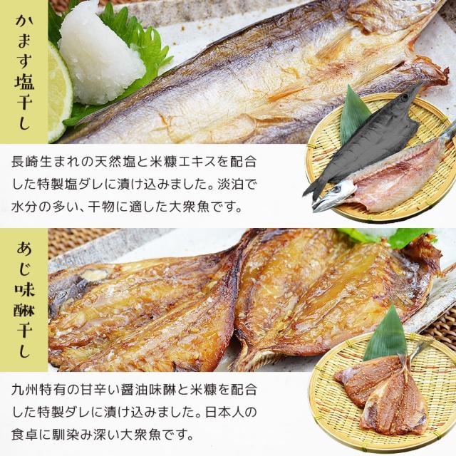 内容量:【長崎加工】あじ干物[一夜干し/九州産]2枚、かます干物[一夜干し/九州産]1枚、あじ干物[みりん干し/九州産]2枚、連子鯛干物[一夜干し/九州産]1枚、いかしゅうまい5玉