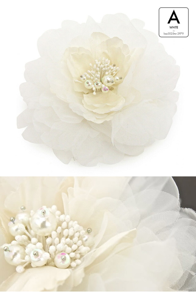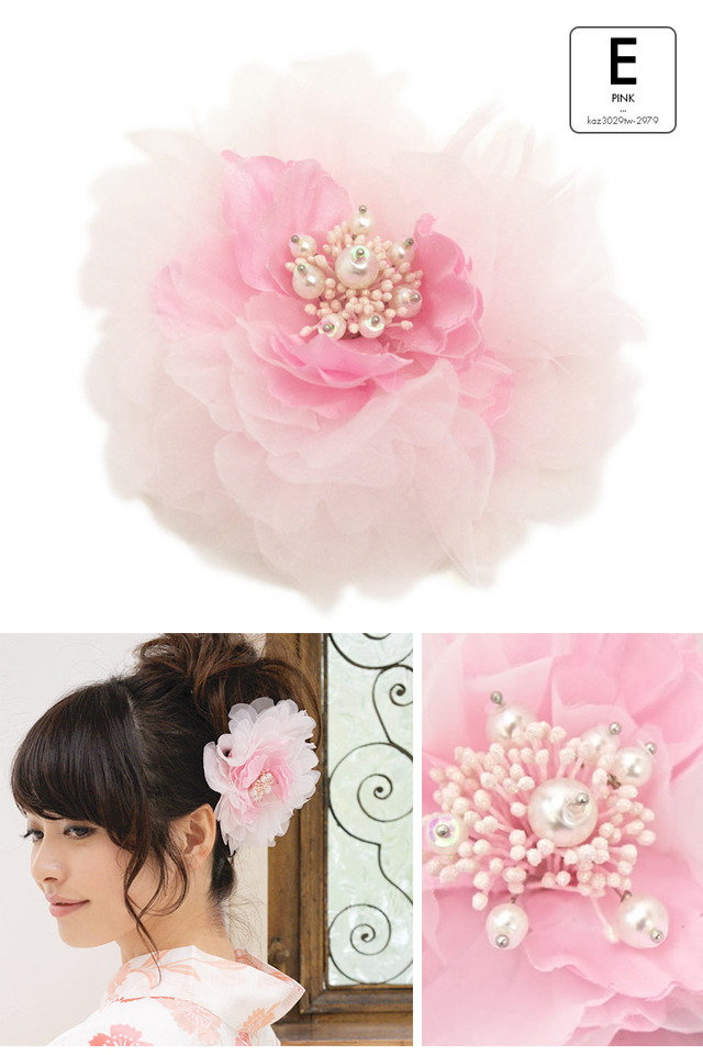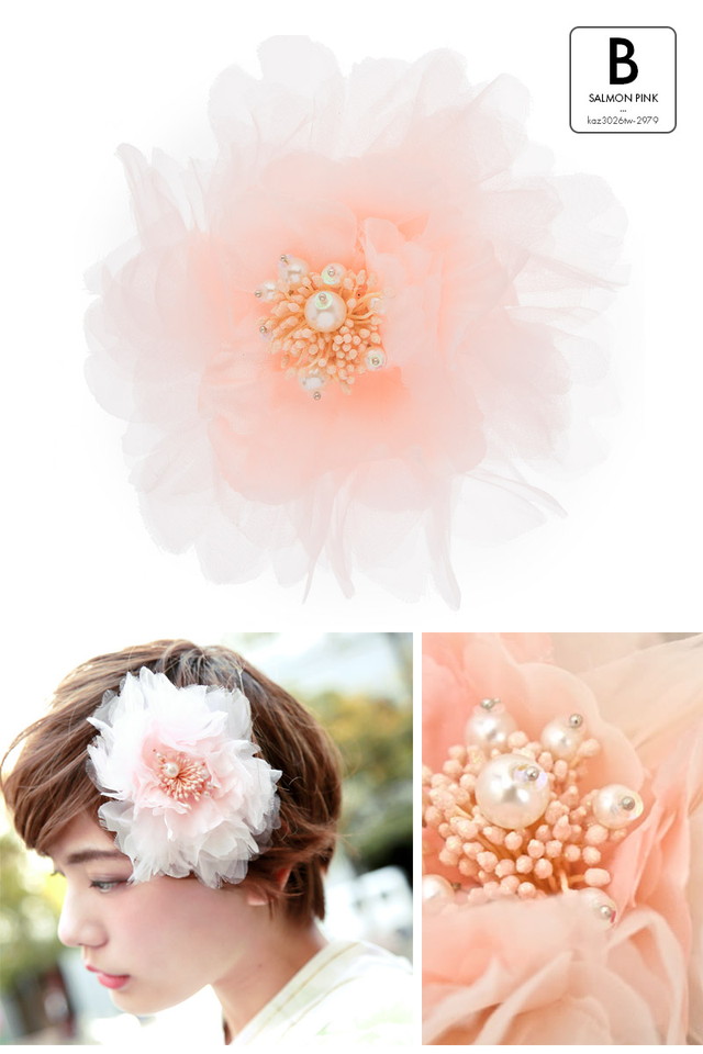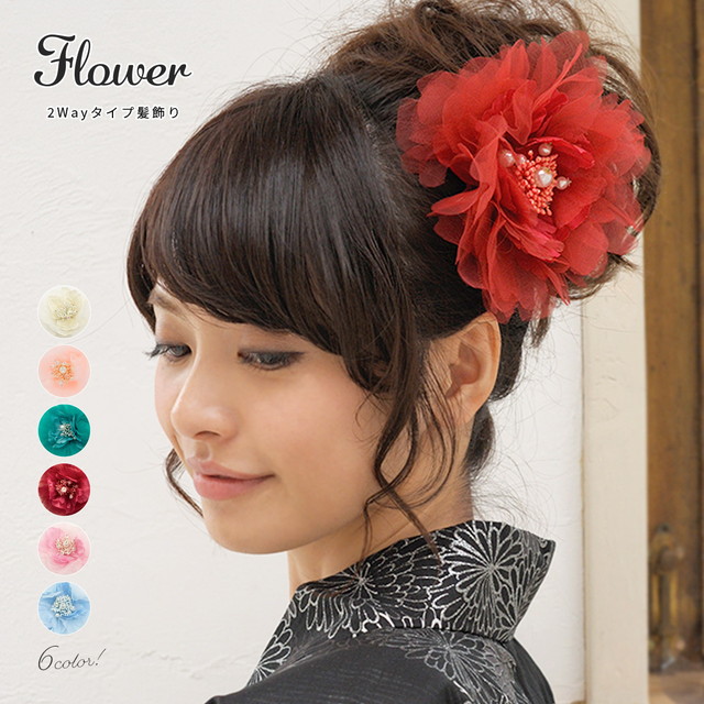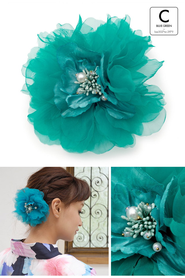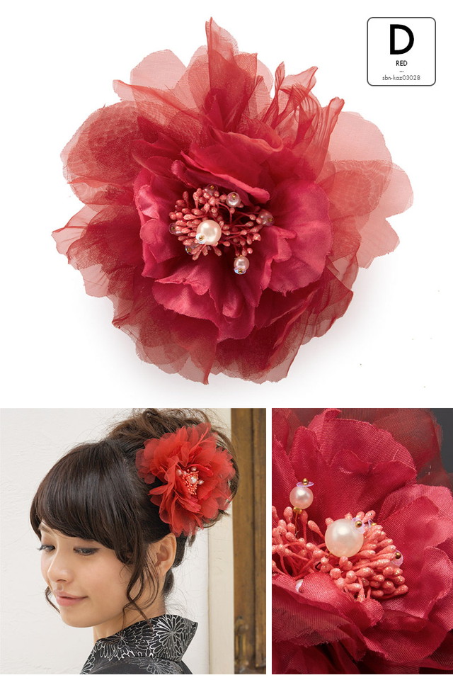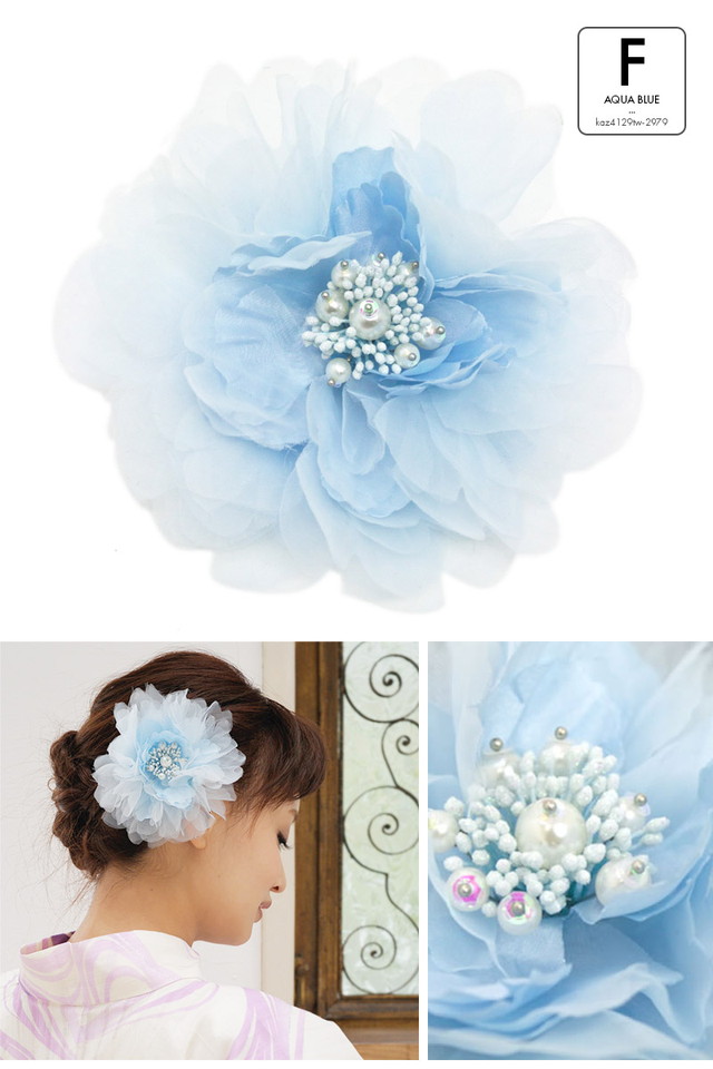 髪飾り 和装 赤 白 ピンク 青緑 花 フラワー オーガンジー パールビーズ コサージュ 浴衣