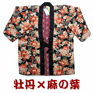 半天 レディース 半纏 はんてん 婦人 中綿入り リバーシブル・牡丹(アカ)x麻の葉(エンジ)あったか 冬用 半天 どてら 男女兼用 ゆったりサイズ