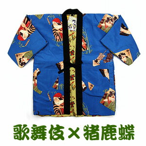 半天 半纏 はんてん 紳士 中綿入り リバーシブル・歌舞伎(ブルー)x猪鹿蝶(クリーム)あったか 冬用 半天 どてら 男女兼用 ゆったりサイズ