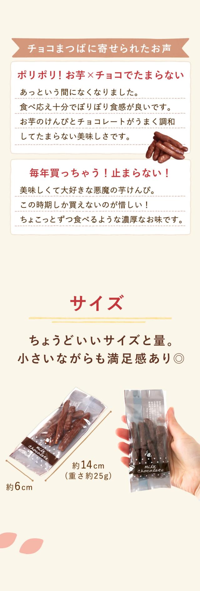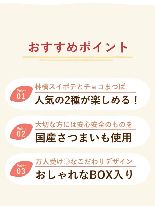 | 原材料 | ●林檎スイートポテト 薩摩芋(国産)、卵、バター、ファットスプレッド、小麦粉、砂糖、林檎、アーモンドプードル、ココア、蜂蜜、シナモン/グリシン、香料 ●チョコまつば さつま芋、植物性油脂、砂糖、乳糖、全粉乳、ココアバター、脱脂粉乳/乳化剤、香料、(一部に乳成分、大豆を含む) |