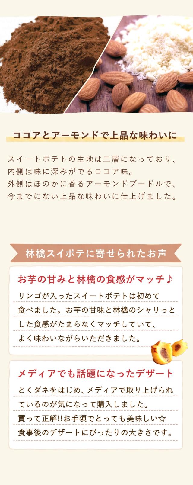 - ただのスイートポテトではなく、中に入ってる林檎のシャリシャリ感がよく、ココア生地も甘すぎず、食べ応えあって、ウマい!! 芋けんぴもチョコのコーティングが珍しく美味しかったです。 配った人達も、美味しかったよ〜と喜んで貰えて良かったです。また、利用したいです。