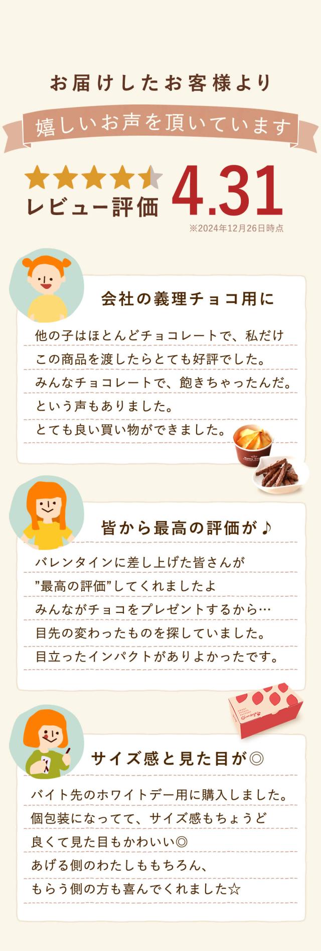 - ホワイトデーのお返した自分用に購入しました。見た目とっても可愛いおしゃれ!ポテトとチョコ手頃なサイズで高評価頂きました。また何か欲しい物を見つけたら購入します