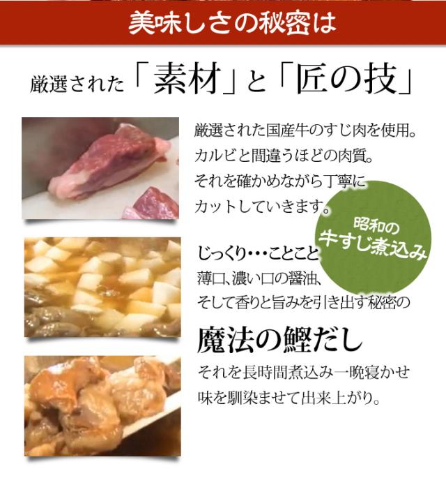 牛すじ肉(国産)、こんにゃく、だいこん、みりん、醤油(薄口、濃い口)、砂糖、鰹だし