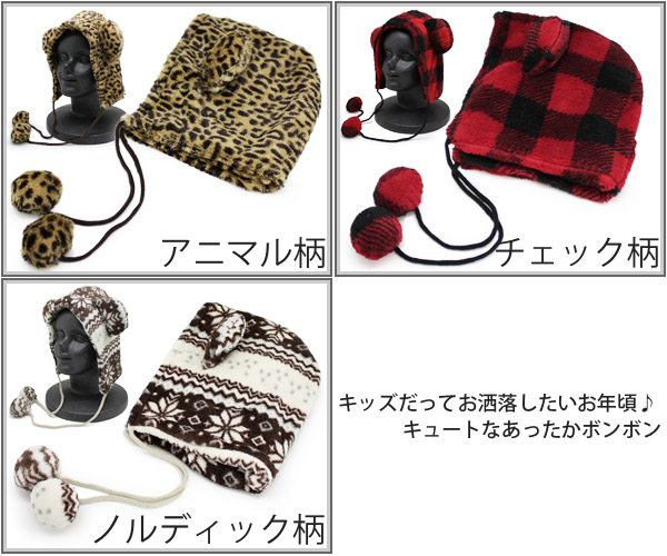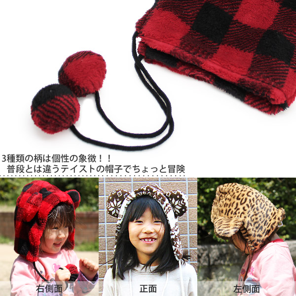 3種類の柄は個性の象徴!!普段とは違うテイストの帽子で、ちょっと冒険してみませんか?人気の赤のタータンチェック柄、アニマル柄、ノルディック柄があります。ゆるやかなラインと動きのあるボンボンが絶妙にマッチしたシルエットです。マシュマロのようなソフトな肌触りに、ボンボンとアニマル耳をプラスして、可愛く1日を楽しみましょう。ボンボンはそのままにしておくのも良し、首元で結んでも良しで、2つのスタイルでキッズのお洒落心をくすぐります♪