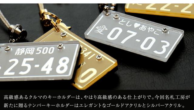 自分へのご褒美にはもちろん、サプライズギフトにぴったりなんです。 1. VIPの所以、他にはない高級感 エレガント ゴージャス なゴールド、クールモダンなシルバー どちらもギラギラとせず上品な色合いとなっています。 輝きを放つストラップは、注目間違いなし。 だから、男性にも好まれやすく、目上の方にもぴったり。 お客様からはそのクオリティの高さに大変ご好評をいただいています。 数多くのリピーター様の存在が魅力の裏付け。 車 バイク をお持ちの方へのプレゼントに自信を持ってオススメします。 2. 本物そっくりそのまんま! 自動車用、バイク用と異なる大きさの比率まで完全再現。 ミニチュア のような かわいい 仕様。 「本物そっくり」「リアル」な実物にご満足いただけたと、たくさんの嬉しい反響をいただいております。 ぜひ実物を手にしていただき、その感動を味わって下さい! 3. 安心のクオリティ アクリルを重ねた仕様のため、彫刻部分に直接傷がつくという事が無く安心。 アクリル自体も傷がつきにくい素材となっておりますので、鍵などと一緒につけていても安心してお使いいただけます。 裏面のビスは飛び出さない仕様になっておりますので、傷やケガなどの心配がありません。 大切な方へのプレゼントとして、ご不安なくお渡しいただけます。 - 名前入り ・お好きな数字も可能♪ - 「記念日用」をご選択いただければ、お好きな文字をお入れすることが出来ます。 2人の名前を彫刻してペア キーホルダー 、ストラップ としてお使いの方、 家族 で おそろい にしてお使いいただいている方も。 “ナンバープレート”は思い入れのある数字を選んでいる方も少なくありません。 だからこそもらったら絶対にうれしいプレゼント。 「こんなのあるんだ〜!」というサプライズをお届け。 さらにこの「ナンバープレートストラップ VIP」なら他とは違う高級感。 お渡しするお相手に、きっと笑顔になってもらえるギフトです♪ [ ご利用シーンなど ] 男性にはもちろん女性にも 車 マイカー 単車 バイク が大好きなあの人へ… バレンタイン 父の日 敬老の日 バースデープレゼント 新車祝い 新車購入記念 納車祝い ご成約プレゼントに。 お父さん 旦那さん 彼氏 に誕生日プレゼントに キーケース とセットで、など様々な 記念日に。 思いを込めて 交通安全 のお守りに、とお渡しいただくのもおすすめです。 |