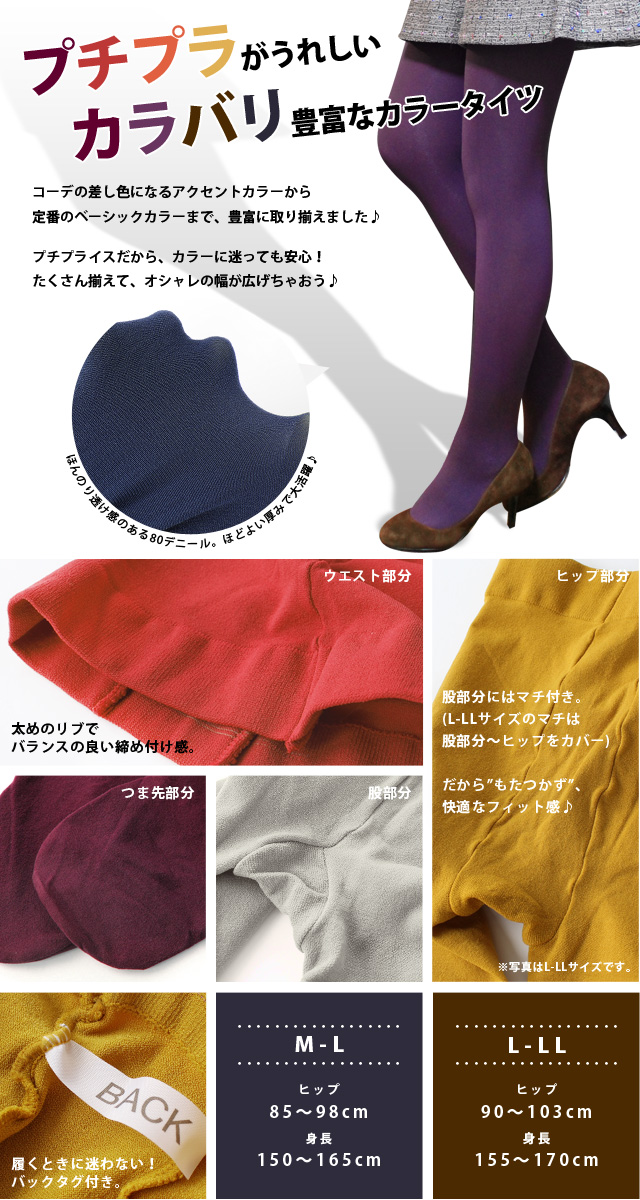 レディース タイツ | 80デニール マチ付き カラータイツ | 2サイズ展開