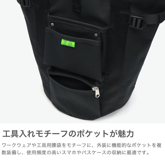 工具用腰袋をモチーフにした、機能美あふれる『UNION』シリーズのリュックサック。軽量で色落ちにくいポリエステルキャンバスに、外装ポケットが映えるデザイン。24Lのたっぷり容量で、通勤から旅先までスマートに対応します。カジュアルな装いにもなじむ、実用性抜群の一品です。